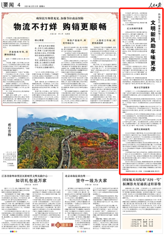 人民日報2月13日第4版《熱鬧紅火、健康環(huán)保——文明新風(fēng)助年味更濃》一文中提到: