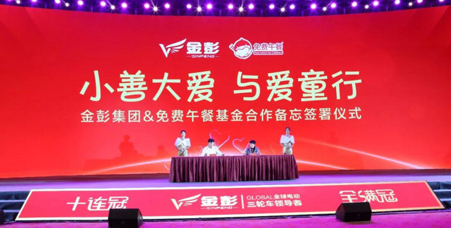 早在2018年1月舉行的年度盛典上,金彭與中國社會福利基金會免費午餐基金簽署協議,達成長期戰略合作,金彭承諾自2018年起,每賣出一輛金彭電動三輪車,就會向免費午餐基金捐贈一元錢,每年向免費午餐基金捐贈不少于100萬元用于幫助中國貧困地區留守兒童免于饑餓、健康成長,預計三年累計受惠學童75萬人次。