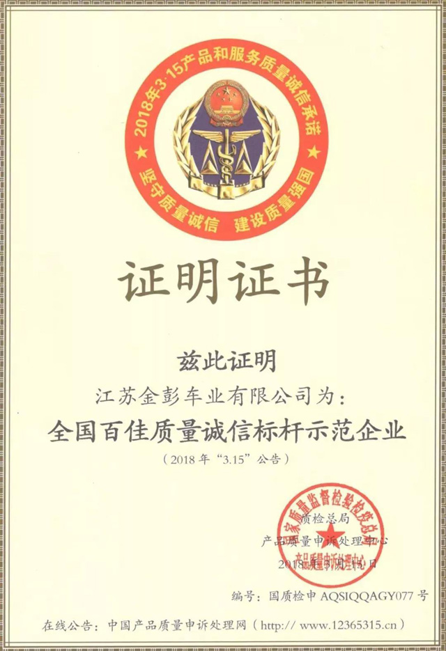 努力,讓自己更出色。2018年,金彭制造了太多大事件,雖談不上驚天動地,但在業內絕對稱得上首屈一指。付出,總會收到回報。2018年3月,金彭被國家質量監督檢驗檢疫總局評選為“全國百佳質量誠信標桿示范企業”,同時獲得此項殊榮的還有華為、格力、海爾、聯想、小米等國民品牌。