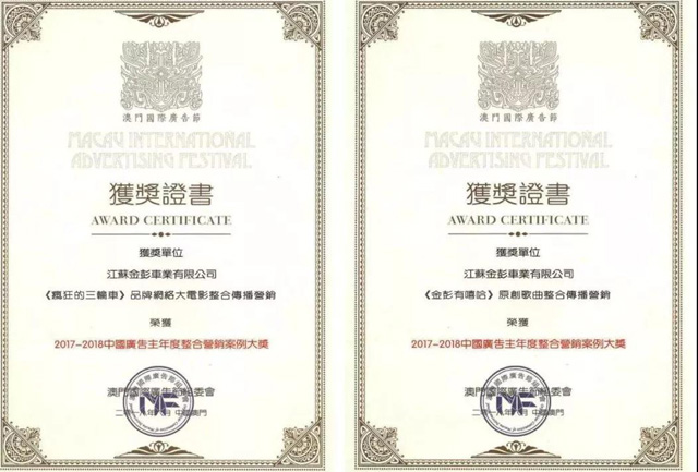 6月5日,金彭憑借原創歌曲《金彭有嘻哈》以及網絡大電影《瘋狂的三輪車》兩部作品一舉斬獲澳門廣告節“2017-2018年度中國廣告主年度整合營銷案例大獎”。澳門廣告節,一直被譽為“亞太地區傳播和營銷領域重要的風向標”,是亞太地區及兩岸三地廣告創意和營銷傳播卓越成果的試金石,年度大獎在業內具有極高的公信力和號召力。